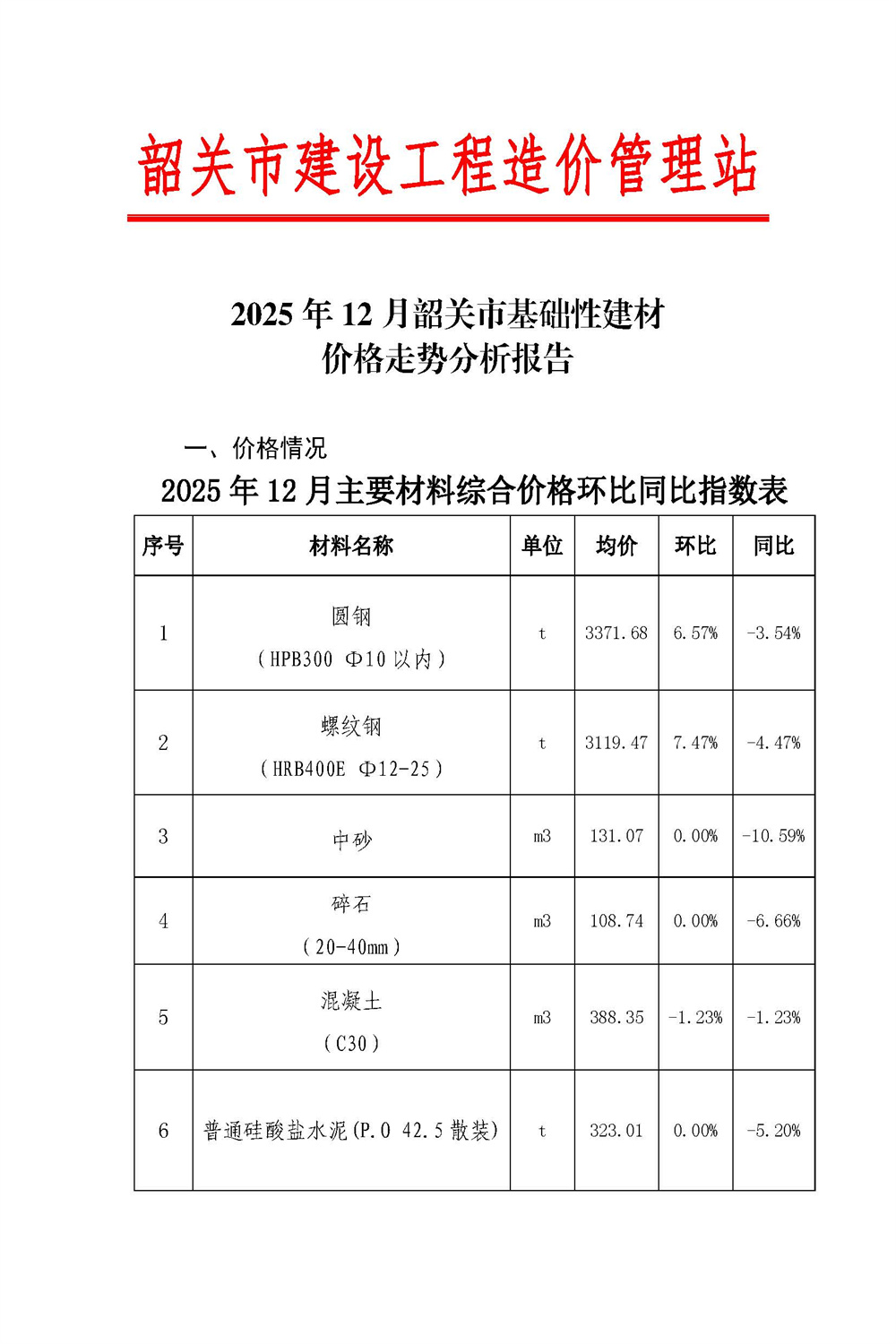 韶关市造价管理站关于基础性建材综合价格(2025年12月)走势分析报告