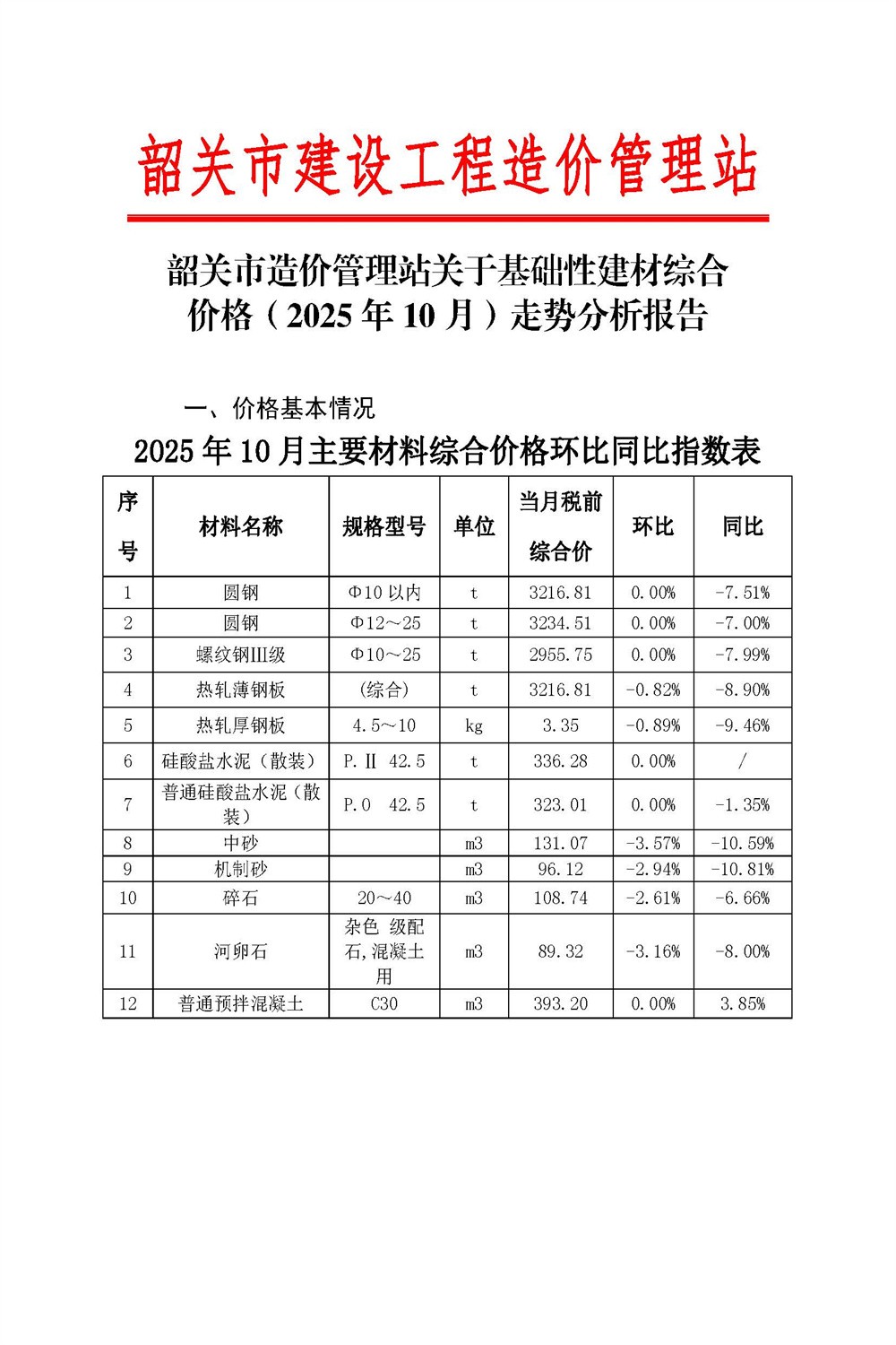 韶关市造价管理站关于基础性建材综合价格(2025年10月)走势分析报告